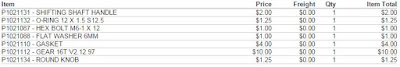 As noted in the prior post it was going to take a few new parts to get my planer up and running with the new Shelix cutterhead. In addition to a replacement "standard" helical gear I also needed a gasket for the gearbox and parts to assemble a new gear shift handle to replace the one that broke during disassembly. After a careful review of the Grizzly G1021 parts diagram I ended up ordering the parts shown below. I was actually somewhat surprised at how reasonable the prices were and the free shipping coupon I received for creating an account didn't hurt either.